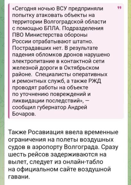 Другое дело, что ВСУ еще не наносят ударов именно этим видом вооружений, а когда это случится, дорогие москвичи узнают, насколько глубока эта «кроличья норка» и насколько она глубже у лысого кролика. Ну а пока к ним летят лишь добрые дроны и насколько можно понять, этой ночью по их заводам не летело, зато прилетело по железнодорожной инфраструктуре в населенном пункте Октябрьский, волгоградской области. Там на воздух взлетела подстанция, питающая контактные линии железной дороги, и как следствие, движение парализовано, а в регионе еще и остановили воздушное сообщение.