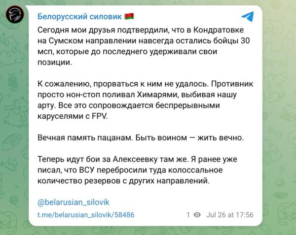 И вот, пусть и в небольшом формате, именно это проигралось на сумском направлении. Несколько дней подряд противник писал о том, что в районе населенного пункта Кондратовка, складывается крайне тяжелая ситуация и что оккупирующие ее силы, могут попасть в окружение. А потом пошли сообщения о том, что окружение замкнулось, но предпринимаются действия по деблокированию этой группы. Численность попавших в окружение, разные источники называли по-разному, но чаще всего упоминалось выражение «больше роты», то есть на момент образования именно классического окружения с внешним и внутренним фронтом, внутри могло находиться 100+ личного состава противника. И насколько можно понять, наши военные просто удерживали группировку, а дроны и артиллерия просто занимались ландшафтным дизайном. И вот в итоге, во вражеском сегменте Сети пошли такие сообщения.