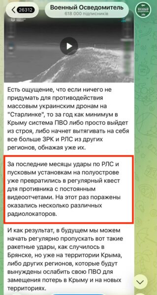 Здесь же они назвали Крым авианосцем и получили патовую ситуацию. Ясно, что утонуть Крым – не утонет, но усилиями сил обороны он стал местом в тылу врага, которое получает наибольшее количество ударов с воздуха. Оно и понятно, ведь благодаря прутину, целей этих там – хоть отбавляй. И поскольку все удары наносятся с воздуха, враг предпринимает колоссальные усилия для его прикрытия. Силы обороны, постоянно «пропалывают» эту «грядку» с тем, чтобы достать военные цели как на территории самого Крыма, так и дальше, в Краснодарском крае, а для этого нужны «коридоры», которые враг не может прикрыть ПВО. Именно прорубывание этих коридоров и ведет к чудовищным потерям зенитных средств противника. Там это понимают уже давно, а теперь начинают писать все более открыто: